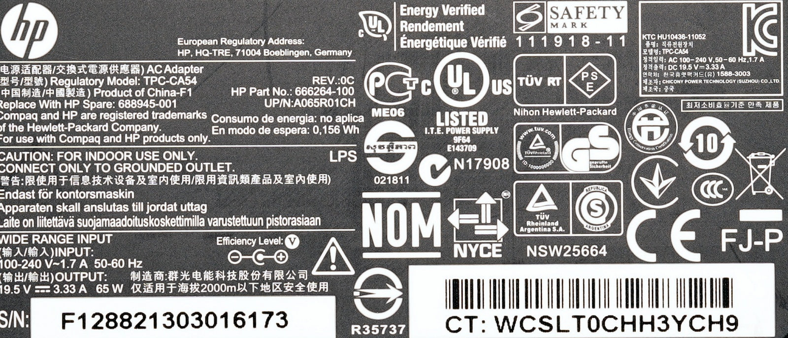 Genuine HP 65W AC Adapter Yellow Tip 19.5V 3.33A TPC-CA54 688945-001