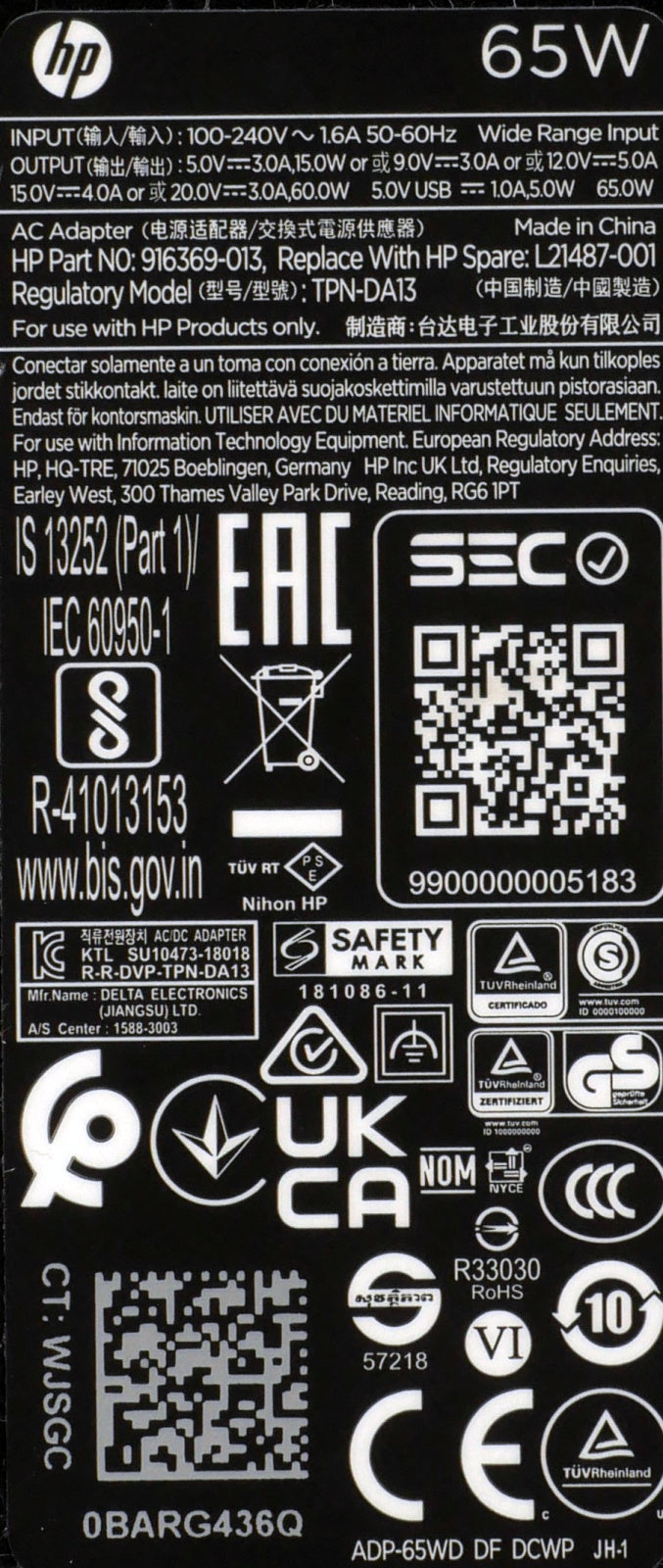 Genuine HP 65W USB-C USB Type-C AC Adapter TPN-DA13 916369-013 L21487-001